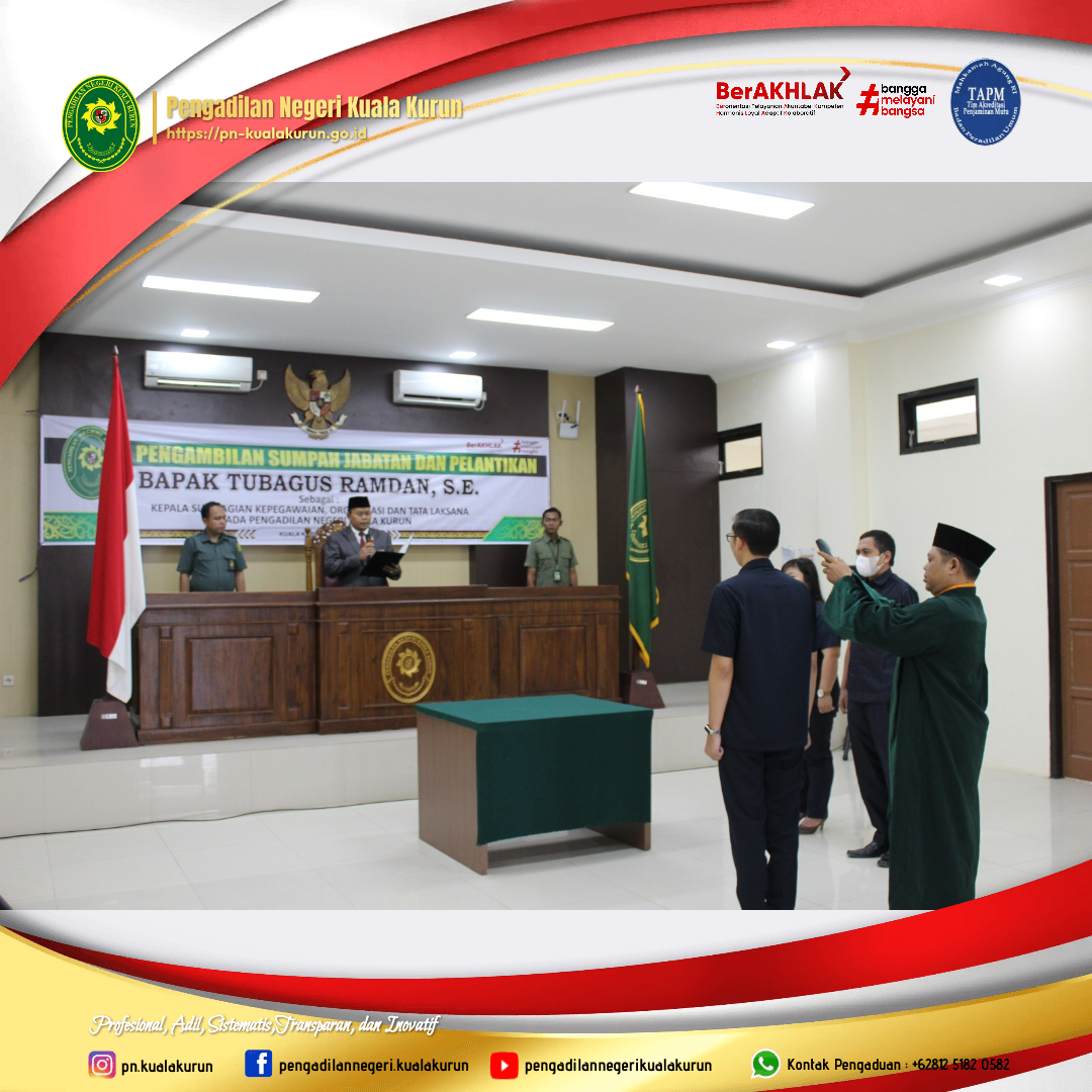 Kuala Kurun | Jumat, 5 Mei 2023, Ketua Pengadilan Negeri Kuala Kurun Bapak Bukti Firmansyah S.H., M.H. melantik dan melaksanakan Pengambilan Sumpah Jabatan kepada Kepala Sub Bagian Bagian Kepegawaian, Organisasi dan Tata Laksana Pengadilan Negeri Kuala Kurun Tubagus Ramdan, S.E. yang sebelumnya menjabat sebagai Plt. Kasubbag Kepegawaian, Organisasi dan Tata Laksana Pengadilan Negeri Kuala Kurun.