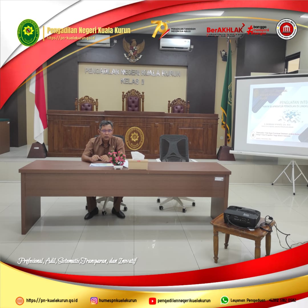 Kuala kurun, 5 November 2024. Bertempat Diruang Sidang Cakra Pengadilan Negeri Kuala Kurun Telah Dilaksanakan Sosialisasi Penguatan Integritas Hakim dan Aparatur Peradilan di Lingkungan Pengadilan Negeri Kuala Kurun dan Sosialisasi Pengarahan Dirjen Badilum Tentang Langkah-Langkah Visi Mahkamah Agung "Terwujudnya Peradilan Yang Agung".