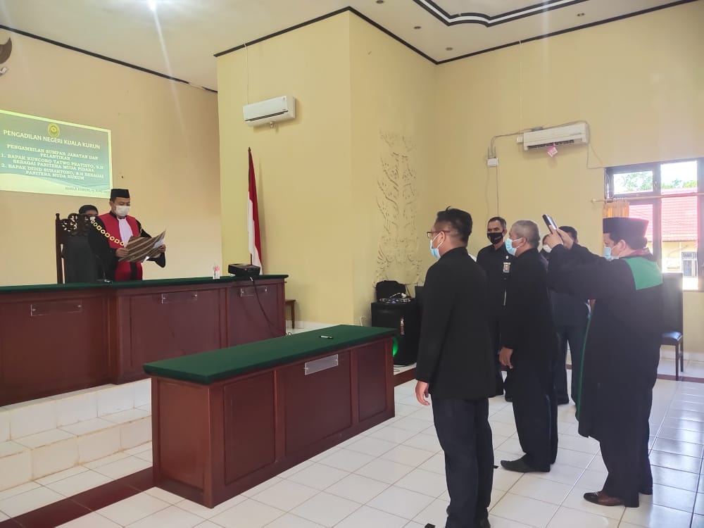 Kuala Kurun, 15 Juni 2021. Bertempat di Ruang Sidang Betang Pengadilan Negeri Kuala Kurun telah dilaksanakan pengambilan sumpah jabatan dan Pelantikan Bapak Kuncoro Tatwo Pratisto, S.H. sebagai Panitera Muda Pidana dan Bapak Didid Suhartono, S.H. sebagai Panitera Muda Hukum Pengadilan Negeri Kuala Kurun oleh Ketua Pengadilan Negeri Kuala Kurun.